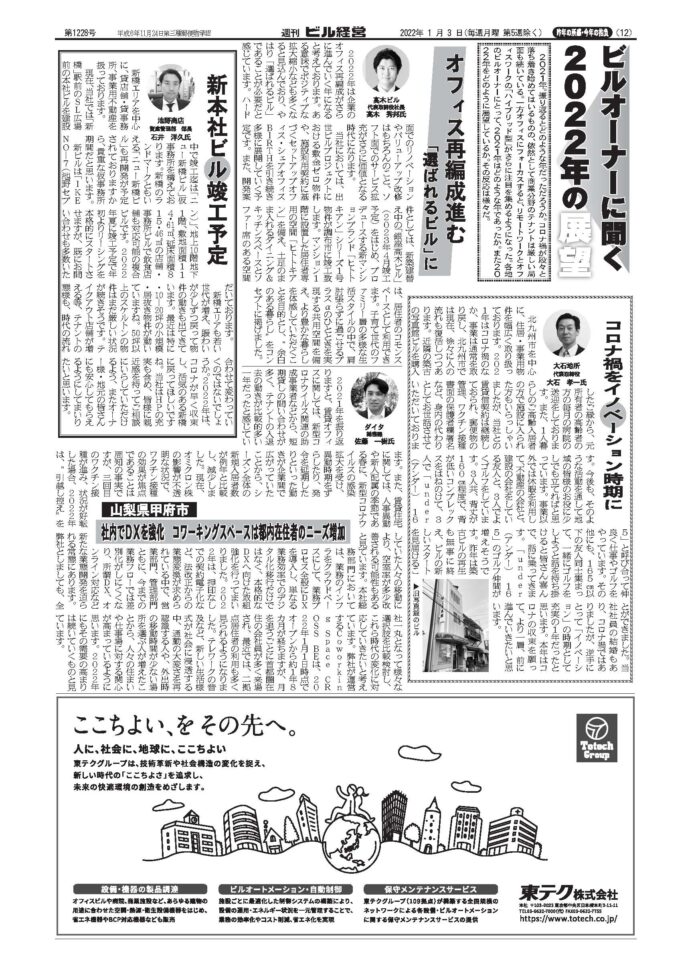 In the New Year Special Edition of Weekly Building Management published on January 3, 2022, we were interviewed by President and CEO Hidekuni Takagi.