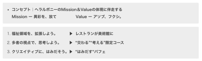 This project divides the exhibition period into three parts, each focusing on the original artwork of one artist with disabilities. Throughout the period, we will offer original art coasters designed in conjunction with the exhibited works, along with sweets (parfaits) conceived inspired by the art. Additionally, each phase will feature special events where guests can savor a course meal inspired by Art Brut, watch videos of the artists at work, and attend gallery talks led by Hérault Bonie staff. Experience the unique brilliance of artists with disabilities through sight, taste, and all five senses. During the exhibition, 10% of sales from the collaboration menu will be returned to the artists as licensing fees.