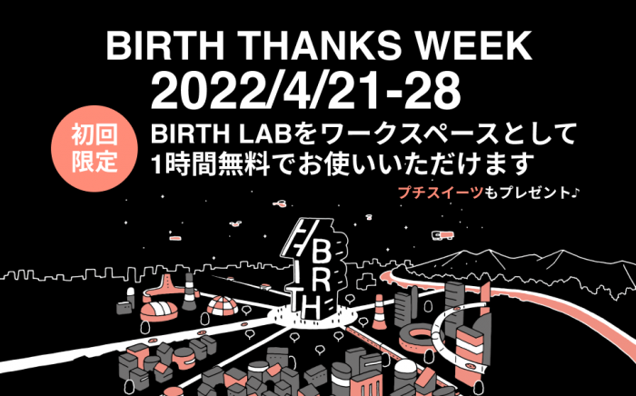 2022年4月20日にBIRTHのブランドサイトがリニューアルしたことを記念し、BIRTH THANKS WEEK を開催いたします。この期間中、BIRTH LABにお越しくださったみなさまは、ドロップイン1時間無料(はじめての方限定)& プチスイーツをプレゼントいたします。ぜひお気軽にお立ち寄りください。 【 BIRTH THANKS WEEK 】 期間:2022年4月21日(木)〜28日(木) 特典: BIRTH LABにお越しくださった皆様は ・ドロップイン利用 1時間無料 ※ はじめての方限定 ・プチスイーツプレゼント (BIRTH LAB住所) 東京都港区麻布十番2丁目20−7 髙木ビル1F